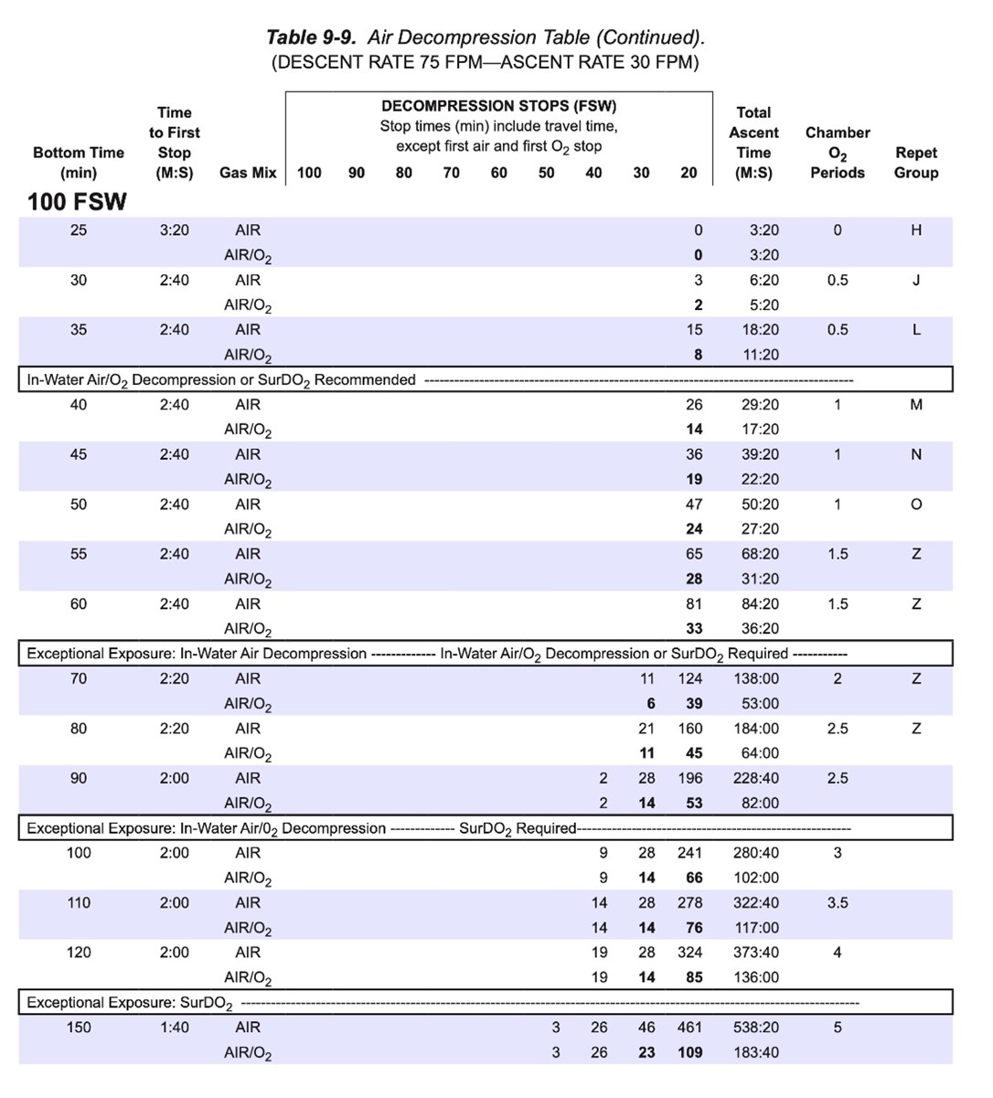 Facsimile from USN Diving Manual Rev 7 of the 100 fsw (30 msw) schedules for air and Air/O2 decompression.