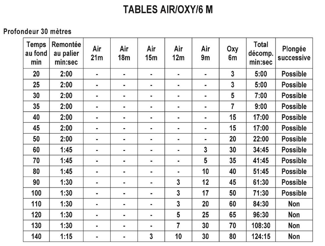 Facsimile of the MT92 “Table 5” (6 msw oxygen) for 30msw table depth.