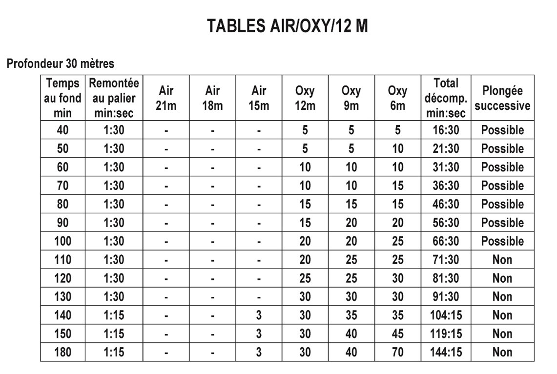 The French MT 92 tables were originally published in the 1992 revision of the French diving regulations. They included a complete set of air and mixed gas tables, including Air/Standard (standard air table), Air/Oxy/6m (air tables with oxygen stop at 6msw intended for in-water decompression), Air/Oxy/12m (air tables with oxygen stop at 12 msw intended for closed bell /TUP decompression) and Air/Surface decompression. The tables came complete with nitrox, repetitive, altitude, caisson and split-level diving procedures. A contingency procedure allows conversion to air breathing in the event of a failure in oxygen delivery. The decompression for a repetitive dive is calculated based on the sum of the actual bottom time and a residual time-penalty from the preceding dive. The residual time-penalty will depend on the surface interval as well as the depth of the repetitive dive.