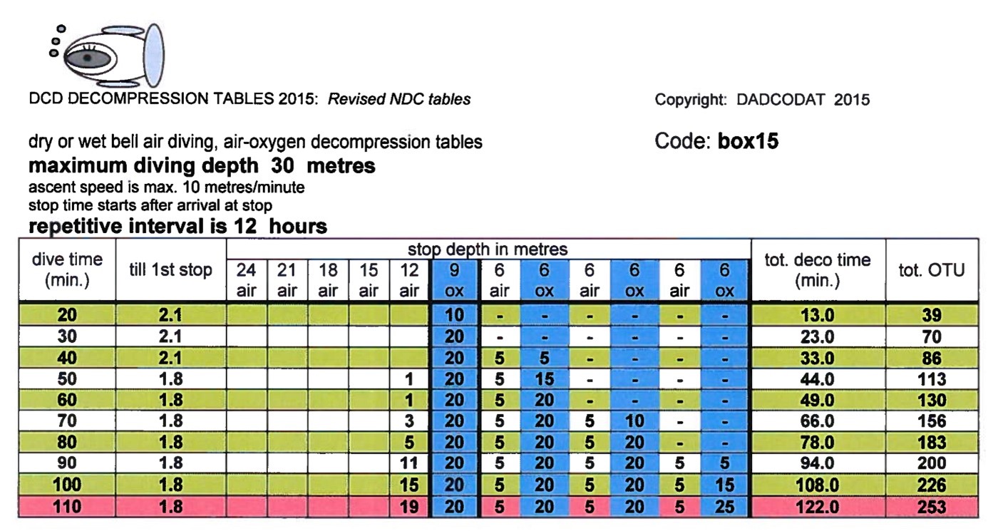 The DCD AoxTUP2B TUP tables (DCD TUP tables) are not published in public but have been developed for the Dutch diving contractor N-Sea by Prof Wouter Sterk. The tables are modification of decompression tables originally developed for caisson work (Wouter Sterk, personal communication, January 2023). The tables range depths from 12 to 51 msw with the diver breathing air as the bottom gas. Compressed air is breathed on decompression stops (3 msw steps) from 24 to 18 msw. The tables are designed to allow the divers 15 min transfer time from the bell to the decompression chamber breathing air. Decompression stops at 15 msw and shallower are planned with oxygen breathing. The shallowest decompression stop is either 6 or 3 msw. A five min air break is planned after every 20 (6 and 9 msw stop) or 10 (15 msw stop) of oxygen breathing. No air break is scheduled during oxygen breathing at 3 msw.