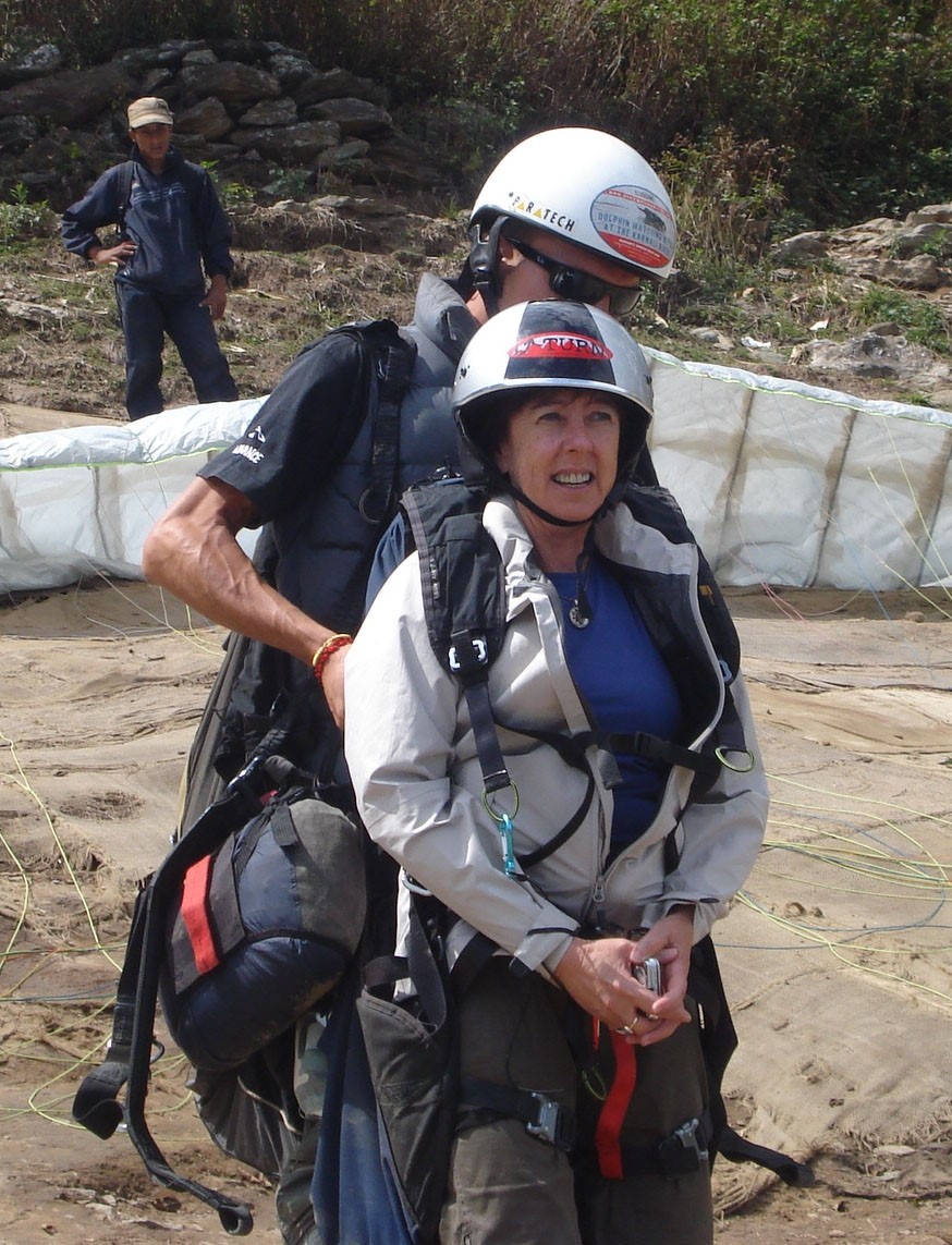 (Photo of Jane Heyworth paragliding in Nepal.)