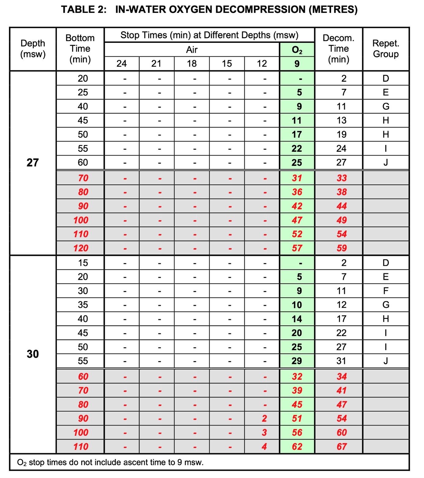 Facsimile from the DCIEM “Table 2” in-water oxygen decompression procedure. 27 and 30 msw table depth