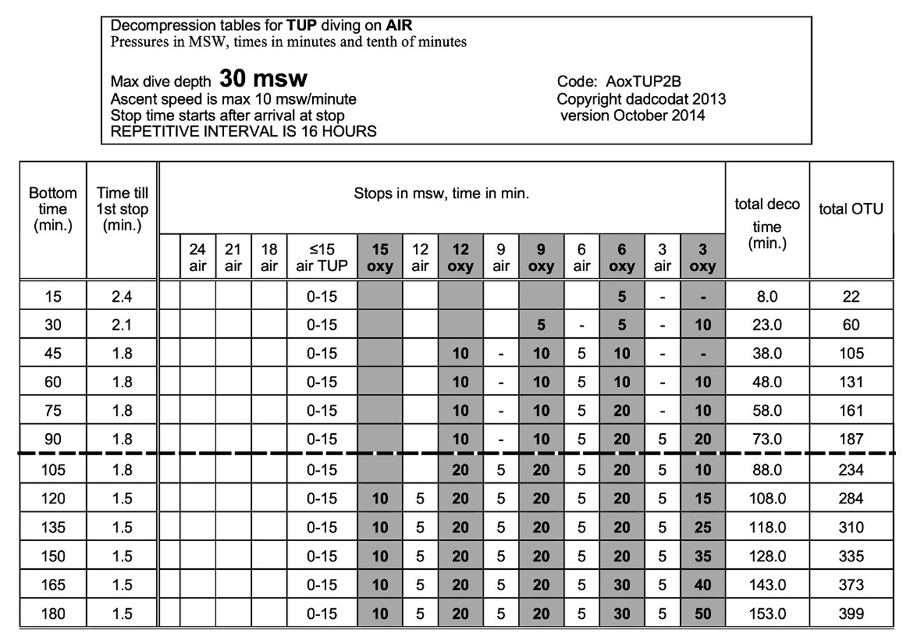 The DCD AoxTUP2B TUP tables (DCD TUP tables) are not published in public but have been developed for the Dutch diving contractor N-Sea by Prof Wouter Sterk. The tables are modification of decompression tables originally developed for caisson work (Wouter Sterk, personal communication, January 2023). The tables range depths from 12 to 51 msw with the diver breathing air as the bottom gas. Compressed air is breathed on decompression stops (3 msw steps) from 24 to 18 msw. The tables are designed to allow the divers 15 min transfer time from the bell to the decompression chamber breathing air. Decompression stops at 15 msw and shallower are planned with oxygen breathing. The shallowest decompression stop is either 6 or 3 msw. A five min air break is planned after every 20 (6 and 9 msw stop) or 10 (15 msw stop) of oxygen breathing. No air break is scheduled during oxygen breathing at 3 msw.